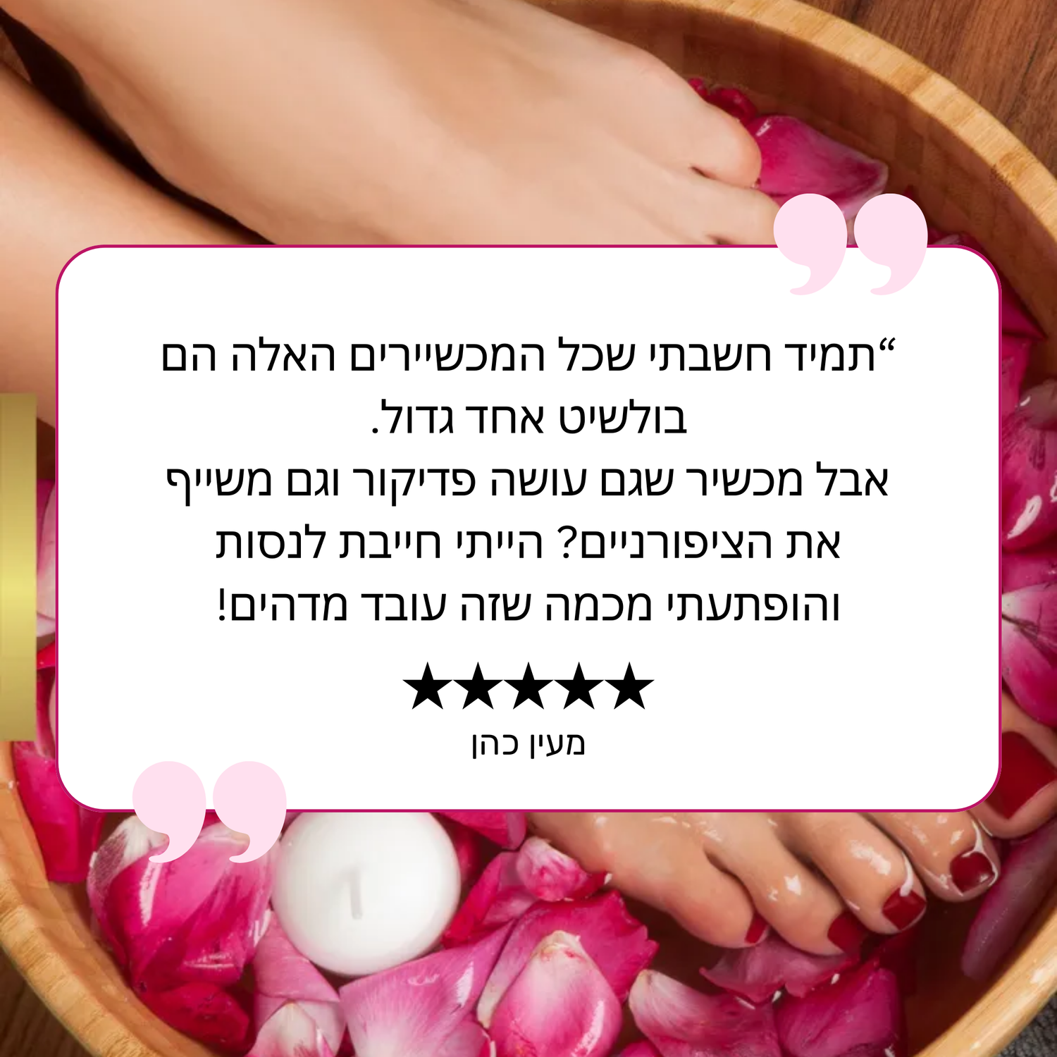 "ממש אהבתי את המכשיר הזה! התוצאה מדהימה, אפילו טיפולי פדיקור לא עזרו לרגליים שלי כמו עכשיו וזה כל כך זול לעומתם, אני ממש מרוצה"