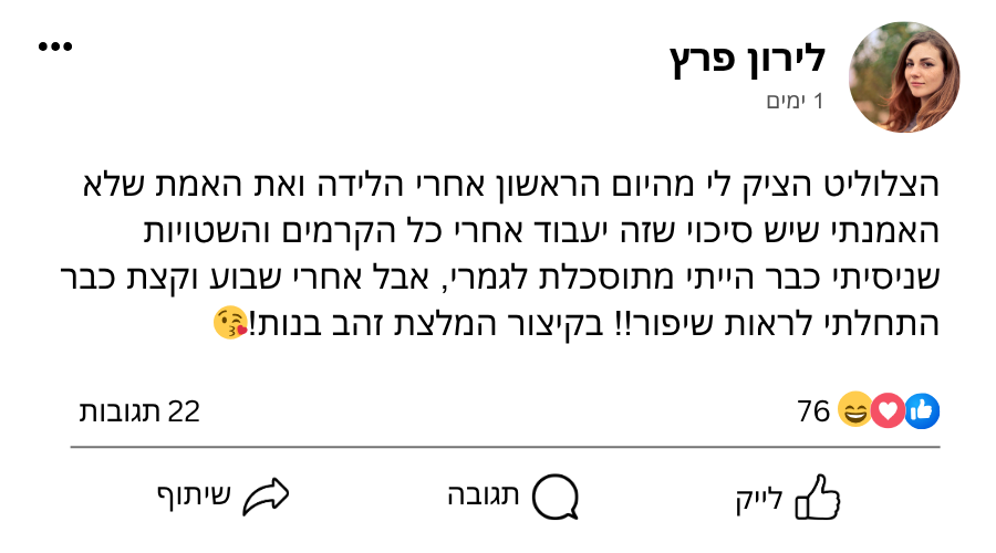 הצלוליט הציק לי מהיום הראשון אחרי הלידה ואת האמת שלא האמנתי שיש סיכוי שזה יעבוד אחרי כל הקרמים והשטויות שניסיתי כבר הייתי מתוסכלת לגמרי, אבל אחרי שבוע וקצת כבר התחלתי לראות שיפור!! בקיצור המלצת זהב בנות!😘